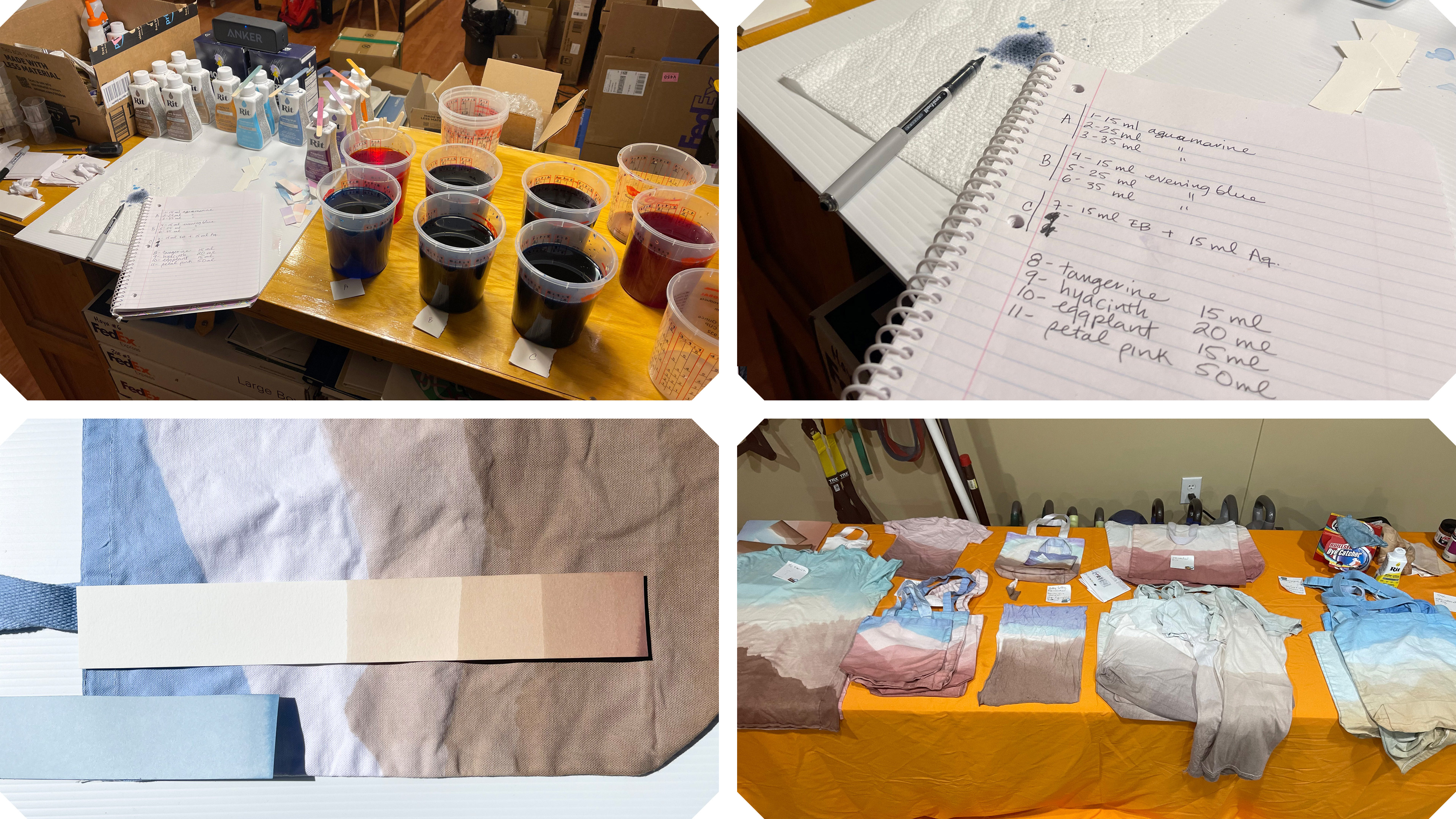 Moving from paper to fabric brought on a slew of challenges as the materials behaved very differently and required different dyes. While the papers were relatively easy to dial in using RIT liquid dyes, the tote bags (and T-shirts) required powdered, reactive dyes, along with a few pre- and post-dying chemicals to, first, prep the fabric for absorbing the dye and then, second, to keep dye from coming off after washing it. Also, they were more difficult to handle because of, well, the handles.
